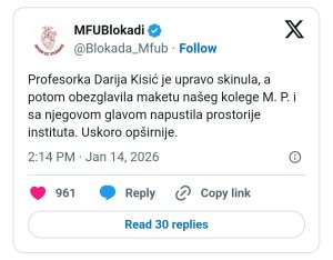 „Profesorka Darija Kisić je upravo skinula, a potom obezglavila maketu našeg kolege M. P. i sa njegovom glavom napustila prostorije instituta. Uskoro opširnije“, napisali su studenti.